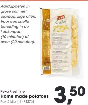 Geniet van heerlijke zelfgemaakte aardappelen met de Home made potatoes van Peka Freshline. Deze aardappelen zijn gesneden in grove stukken en bereid met plantaardige oliën voor een extra smaakvol resultaat. Met een bereidingstijd van slechts 10 minuten in de koekenpan of 20 minuten in de oven, zet je in een handomdraai een heerlijke maaltijd op tafel. De verpakking bevat 2 kilo aardappelen, genoeg voor het hele gezin. Bestel de Home made potatoes van Peka Freshline nu voor slechts €3,50 en geniet van de authentieke smaak van verse aardappelen bij jou thuis. Perfect voor bij een peka gerecht of als smaakvolle toevoeging aan iedere maaltijd.