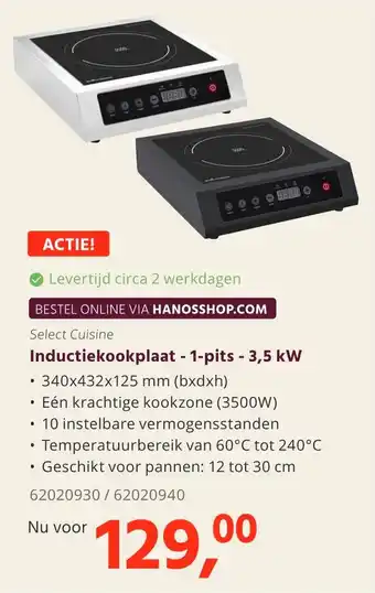 De prijs van de Inductiekookplaat - 1-pits - 3,5 kW kan ook teruggevonden worden hierboven op de pagina, samen met de datum van wanneer de aanbieding beschikbaar is. Ook kun je de prijzen in de huidige HANOS folder of op de HANOS website controleren. De aanbiedingen verzekeren je van het kopen van de HANOS producten voor de laagste prijs.