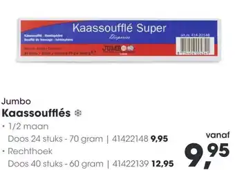 De aanbieding is verkrijgbaar in verschillende winkels, bekijk alle producten om de goedkoopste Jumbo Kaassoufflés te krijgen. Als je graag wilt kijken of het artikel met meer korting te koop is in een andere winkel, bekijk de categorie 'Groothandel'. Wellicht vind je deze aanbiedingen ook interessant: Metro Chef kaassoufflés, Jumbo Bloemkool & Jumbo Frikandellen.