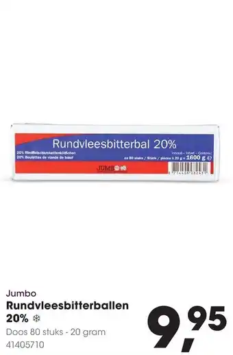 De Jumbo Rundvleesbitterballen 20% zijn heerlijke rundvleesbitterballen met een vulling van maar liefst 20% rundvlees. De doos bevat ca. 80 stuks van elk 20 gram, wat neerkomt op een totaalgewicht van 1600 gram. Deze smakelijke bitterballen zijn perfect als snack tijdens feestjes of gewoon voor tussendoor. Met de Jumbo Rundvleesbitterballen 20% haal je een echte delicatesse in huis waar iedereen van zal genieten. De krokante korst en smeuïge vulling zorgen voor een ware smaaksensatie. Bestel nu deze heerlijke rundvleesbitterballen van Jumbo en geniet van de authentieke smaak van ambachtelijk bereid rundvlees. Een doos met 80 stuks kost slechts 9,95 en is ideaal voor elke gelegenheid.