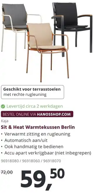 BESTEL ONLINE VIA HANOSSHOP.COM - Kaja Sit & Heat Warmtekussen Berlin is geschikt voor terrasstoelen met rechte rugleuning. Dit warmtekussen verwarmt zowel de zitting als de rugleuning, en kan automatisch aan/uit worden gezet. Daarnaast is het ook handmatig te bedienen. De levertijd is circa 2 werkdagen. De accu is apart verkrijgbaar en niet inbegrepen. Het artikelnummer is 96918080/96918060/96918070. De prijs is 72,00 euro, maar nu tijdelijk afgeprijsd naar 59,50 euro. Geniet van extra comfort en warmte op je terrasstoel met dit handige warmtekussen van Kaja.