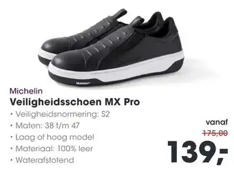 De Michelin Veiligheidsschoen MX Pro is een hoogwaardige veiligheidsschoen die voldoet aan de S2 veiligheidsnormering. Gemaakt van 100% leer en waterafstotend, biedt deze schoen optimale bescherming en comfort. Verkrijgbaar in maten 38 t/m 47 en zowel in een laag als hoog model. De schoen is ontworpen met de nieuwste technologieën van Michelin, waardoor deze duurzaam en slijtvast is. Of je nu op de bouwplaats werkt of in een magazijn, met de Michelin Veiligheidsschoen MX Pro ben je verzekerd van veiligheid en kwaliteit. Nu verkrijgbaar vanaf €139,- in plaats van €175,00. Investeer in je veiligheid en kies voor de betrouwbare bescherming van Michelin.