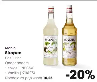 Deze Monin siropen is nu in de aanbieding bij HANOS. Op deze pagina vind je alle informatie over actuele prijzen, actievoorwaarden en looptijd. Vergelijk ook andere relevante aanbiedingen en acties rondom Monin siropen, zodat je altijd de slimste keuze maakt. De aanbieding loopt van 09-03-2026 tot en met 22-03-2026. Is de actie verlopen? Geen probleem – vergelijkbare deals vind je altijd via deze pagina. Volg eventueel de productcategorie om automatisch op de hoogte te blijven van nieuwe aanbiedingen of prijsdalingen voor Monin siropen.Veelgestelde vragen over Monin siropen