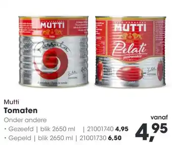HANOS biedt naast de Mutti Tomaten een ruime collectie producten aan. Houd de wekelijkse HANOS folder in de gaten om de beste aanbiedingen en acties te vinden. Naast Mutti Tomaten, kunt u ook de volgende aanbiedingen vinden: Mutti Kers Tomaten, Mutti Tomatenpuree & Mutti tomatensaus Triple concentr.