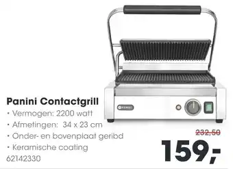 De Panini Contactgrill is een handig keukenapparaat met een vermogen van 2200 watt en afmetingen van 34 x 23 cm. De onder- en bovenplaat zijn geribbeld en voorzien van een keramische coating voor een perfect grillresultaat. Met deze contactgrill kun je eenvoudig en snel heerlijke panini's, tosti's, vlees, vis en groenten bereiden. De grillplaten zijn makkelijk schoon te maken en dankzij de regelbare thermostaat kun je de temperatuur naar wens instellen. De Panini Contactgrill is ideaal voor zowel thuisgebruik als in de horeca. Bestel nu de Panini Contactgrill (artikelnummer: 62142330) voor slechts €232,50 in plaats van €159,- en geniet van de lekkerste gerechten!