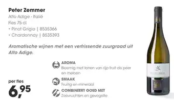 Peter Zemmer Pinot Grigio uit Alto Adige - Italië is een aromatische wijn met een verfrissende zuurgraad. Deze wijn heeft een bloemig aroma met tonen van rijp fruit zoals peer en meloen. De smaak is fruitig en mineraal, perfect in balans. Peter Zemmer Pinot Grigio combineert goed met zeevruchten en gevogelte. Geniet van deze heerlijke wijn in een fles van 75 cl voor slechts 6,995 per fles. Ontdek de unieke smaken van Alto Adige in elke slok van deze kwaliteitswijn. Laat je verrassen door de elegantie en verfijning van Peter Zemmer Pinot Grigio en waan je even in het prachtige Italië.