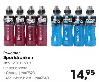 Powerade Sportdranken Tray 12 fles 50 cl bevat onder andere de smaken Cherry en Mountain Blast. Deze sportdranken zijn speciaal ontwikkeld om je lichaam te hydrateren en energie te geven tijdens het sporten. Met de krachtige mix van elektrolyten en koolhydraten helpt Powerade je om optimaal te presteren en sneller te herstellen. Of je nu een fanatieke sporter bent of gewoon een extra boost nodig hebt, Powerade is de ideale dorstlesser. De Tray van 12 flessen van 50 cl is handig om mee te nemen naar trainingen, wedstrijden of gewoon voor onderweg. Bestel nu jouw Powerade Sportdranken Tray 12 fles 50 cl en ervaar de kracht van Powerade voor slechts 14,95.