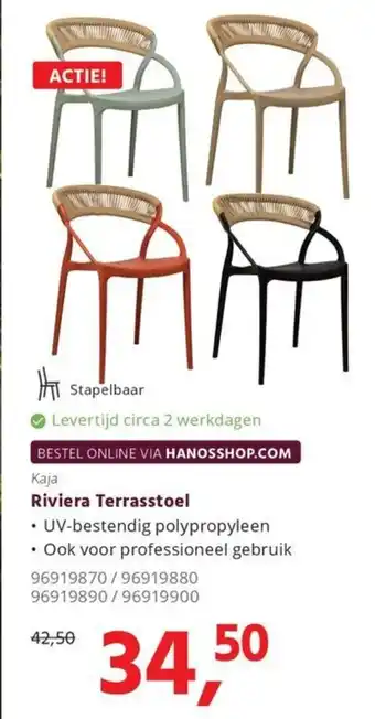 De Riviera Terrasstoel is een stapelbare terrasstoel gemaakt van UV-bestendig polypropyleen, geschikt voor zowel particulier als professioneel gebruik. Met een levertijd van circa 2 werkdagen kun je snel genieten van deze comfortabele en duurzame stoel. De stoel is verkrijgbaar in de kleuren Kaja en Riviera, en wordt geleverd voor een actieprijs van slechts €34,50 in plaats van €42,50. Bestel nu online via HANOSSHOP.COM en maak jouw terras of tuin helemaal compleet met deze stijlvolle en praktische terrasstoel. De Riviera Terrasstoel is een ideale keuze voor iedereen die op zoek is naar kwaliteit, comfort en een aantrekkelijke prijs!