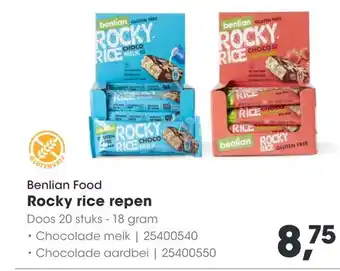 Geniet van de heerlijke Rocky Rice repen van Benlian Food, nu verkrijgbaar in een handige doos met 20 stuks. Deze glutenvrije repen zijn gemaakt van rijst en bedekt met een laagje chocolade. Kies uit de smaken chocolade melk of chocolade aardbei. De repen wegen 18 gram per stuk en zijn perfect als tussendoortje of snack voor onderweg. Dankzij de glutenvrije formule zijn ze geschikt voor mensen met een glutenintolerantie. Bestel nu deze smaakvolle en voedzame repen en geniet van de combinatie van Rocky Rice en chocolade. Ideaal voor thuis, op het werk of in de sporttas. Een doos met 20 stuks kost slechts 8,75 euro.