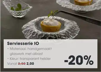 De Serviesserie IO is een prachtige collectie van handgemaakt glaswerk met albast. Het materiaal is van hoge kwaliteit en zorgt voor een luxe uitstraling op tafel. De transparant heldere kleur van het glaswerk geeft een elegante touch aan elke maaltijd. De serviesserie is verkrijgbaar vanaf 2,50 per stuk, maar met de huidige aanbieding betaal je slechts 2,00 per stuk. Profiteer nu van de 20% korting en haal deze stijlvolle serviesserie in huis. Of je nu een chique diner organiseert of gewoon je dagelijkse maaltijden wat extra flair wilt geven, de Serviesserie IO is de perfecte keuze. Bestel vandaag nog en geniet van een luxe tafelsetting!