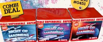 Profiteer nu van de geweldige COMBI DEAL voor slechts €34,95! Deze deal bevat een assortiment van 15 SHOTS cake 1 vuurwerk. Maak je klaar voor een NIGHT OF MADNESS met deze SUPER DEALS SUPER! Deze deal is perfect voor iedereen die op zoek is naar een knallend feest. Mis deze kans niet om je feest onvergetelijk te maken met deze SUPER DEALS SUPER! Bestel nu en geniet van een spectaculaire vuurwerkshow met vrienden en familie. Deze deal is alleen beschikbaar voor een beperkte tijd, dus wacht niet te lang en bestel vandaag nog!