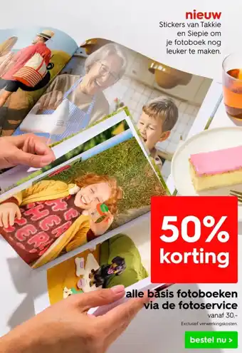 Bestel nu alle basis fotoboeken via de fotoservice met keuze uit stickers van Takkie en Siepie om je fotoboek nog leuker te maken. Profiteer van 50% korting, vanaf 30.-. Exclusief verwerkingskosten. Maak gebruik van deze nieuwe aanbieding en creëer een uniek fotoboek vol herinneringen. Of je nu op zoek bent naar een fotoboek voor je vakantiefoto's, een jubileum of een verjaardag, bij ons ben je aan het juiste adres. Wacht niet langer en bestel nu jouw fotoboek met korting. Personaliseer je fotoboek met de schattige stickers van Takkie en Siepie en maak het nog specialer. Mis deze kans niet en bestel vandaag nog!