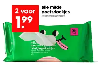 Met deze aanbieding krijg je alle milde hand- en gezichtsreinigingsdoekjes voor slechts 1.99. Alle combinaties zijn mogelijk, dus je kunt zelf kiezen welke varianten je wilt. De doekjes zijn mild voor de huid en ideaal voor het reinigen van zowel je handen als je gezicht. De verpakking bevat 40 doekjes, zodat je een ruime voorraad hebt. Of je nu onderweg bent of thuis, deze handige poetsdoekjes zijn altijd van pas. De doekjes zijn ook geschikt voor gevoelige huidtypes en hebben een aangename geur. Profiteer nu van deze voordelige aanbieding en zorg ervoor dat je altijd fris en schoon bent, waar je ook bent.