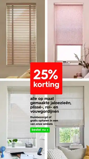 Bestel nu alle op maat gemaakte jaloezieën, plissé-, rol- en vouwgordijnen met 25% korting. Kies ervoor om ze thuisbezorgd te krijgen of gratis op te halen in een van onze winkels. Met een ruime keuze aan stijlen en kleuren vind je gegarandeerd de perfecte raamdecoratie voor jouw interieur. Of je nu op zoek bent naar moderne pennen jaloezieën of sfeervolle vouwgordijnen, wij hebben het allemaal. Laat je inspireren door ons uitgebreide assortiment en geef je huis een nieuwe uitstraling. Profiteer nu van de korting en bestel jouw nieuwe raamdecoratie vandaag nog. Creëer de perfecte ambiance in elke kamer met onze hoogwaardige gordijnen en jaloezieën.