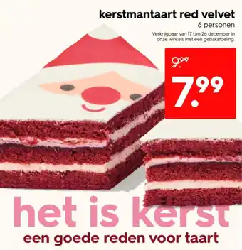 Verkrijgbaar van 17 t/m 26 december in onze winkels met een gebakafdeling. Het is kerst, een goede reden voor taart. Geniet van onze heerlijke kerstmantaart red velvet, geschikt voor 6 personen, voor slechts 7.99. Deze feestelijke taart is perfect voor het vieren van de kerstdagen met vrienden en familie. De fluweelzachte rode cake gecombineerd met romige witte topping zorgt voor een smaakexplosie die je niet wilt missen. Bestel nu jouw kerstmantaart red velvet en maak de feestdagen extra speciaal. Trakteer jezelf en je dierbaren op deze verrukkelijke lekkernij en proef de magie van kerst in elke hap.
