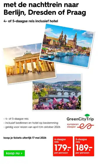 Koop nu je tickets voor een 4- of 5-daagse reis inclusief hotel op bestemming. Geniet van een comfortabele reis met de European Sleeper naar Berlijn, Dresden of Praag. De prijs van 179-189,- per persoon is inclusief bedlinnen en geldig voor reizen van april t/m oktober 2026. Ontdek de prachtige steden en bespaar op hotelkosten door te overnachten in de nachttrein. Boek uiterlijk 17 mei 2026 en maak je klaar voor een GreenCityTrip vol avontuur en comfort. Laat je verrassen door het gemak en de charme van reizen per trein en ontdek de schoonheid van Europa op een duurzame manier. Mis deze unieke ervaring niet en reserveer nu je plek!