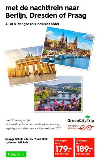 Geniet van een 4- of 5-daagse reis inclusief hotel op bestemming met de European Sleeper. De GreenCity Trip is geldig voor reizen van april t/m oktober 2026. Koop je tickets uiterlijk 17 mei 2026 op hema.nl/tickets. Ontdek de prachtige steden Berlijn, Dresden of Praag en geniet van het gemak van reizen met de nachttrein. De prijs van 179-189,- per persoon is inclusief bedlinnen en hotelaccommodatie. Ervaar het comfort en de duurzaamheid van de European Sleeper, ook bekend als ES. Boek nu en beleef een onvergetelijke reis naar deze bruisende Europese bestemmingen.