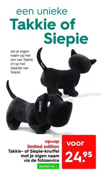 Maak je knuffel extra speciaal met een unieke touch! Kies uit Takkie of Siepie en zet je eigen naam op het oor van Takkie of op het staartje van Siepie. Met de fotoservice kun je eenvoudig je naam doorgeven. Of het nu voor jezelf is of als cadeau voor Saskia, Nick of een andere dierenliefhebber, deze limited edition knuffels zijn een geweldige toevoeging aan je collectie. Wees er snel bij, want op=op! Bestel nu en geniet van je gepersonaliseerde Takkie- of Siepie-knuffel met je eigen naam erop. Gegarandeerd urenlang knuffelplezier met deze schattige en originele knuffels.
