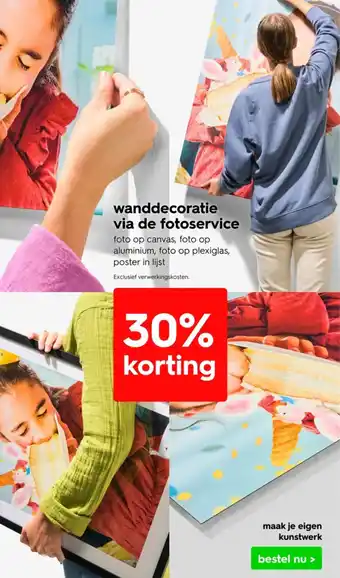 Creëer een unieke sfeer in huis met wanddecoratie via de fotoservice. Kies uit verschillende opties zoals foto op canvas, foto op aluminium, foto op plexiglas of een poster in lijst. Maak je eigen kunstwerk door jouw favoriete foto's te laten afdrukken. Profiteer nu van 30% korting op alle wanddecoratie. Bestel snel en eenvoudig online en laat jouw foto's tot leven komen aan de muur. Exclusief verwerkingskosten. Geef je interieur een persoonlijke touch met prachtige wanddecoratie die past bij jouw stijl en smaak. Transformeer elke ruimte in een galerij van herinneringen en geniet dagelijks van jouw eigen creaties. Bestel nu en geef jouw huis een nieuwe uitstraling!