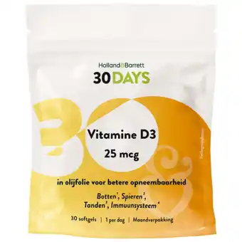Holland & Barrett 30DAYS Vitamine D3 25mcg - 30 softgels aanbieding bij Holland & Barrett – binnenkort verwacht