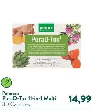 De aanbieding is verkrijgbaar in verschillende winkels, bekijk alle producten om de goedkoopste PuraD-Tox 11-in-1 Multi te krijgen. Als je graag wilt kijken of het artikel met meer korting te koop is in een andere winkel, bekijk de categorie 'Drogist en Parfumerie'. Wellicht vind je deze aanbiedingen ook interessant: Purasana PuraD-Tox 11-in-1 Multi - 30 capsules, Purasana PuraD-Tox Capsules & Bonusan Rhus tox-SAN Druppels.