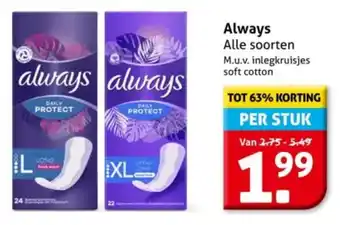De prijs van de Always kan ook teruggevonden worden hierboven op de pagina, samen met de datum van wanneer de aanbieding beschikbaar is. Ook kun je de prijzen in de huidige Hoogvliet folder of op de Hoogvliet website controleren. De aanbiedingen verzekeren je van het kopen van de Hoogvliet producten voor de laagste prijs.