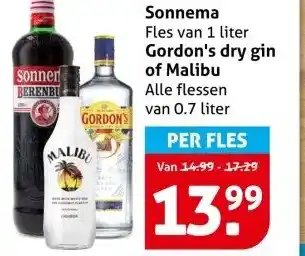 Sonnema , Gordon's dry gin of Malibu korting bij Hoogvliet
