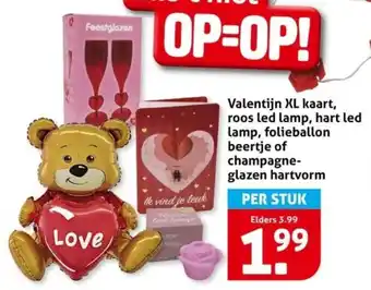 Valentijn XL kaart, roos led lamp, hart led lamp, folieballon beertje of champagne glazen hartvorm aanbieding bij Hoogvliet