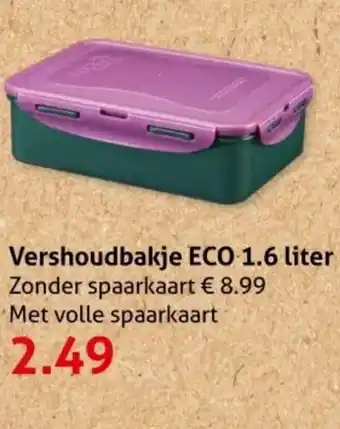 Het Vershoudbakje ECO van 1.6 liter is perfect voor het bewaren van voedsel op een milieuvriendelijke manier. Gemaakt van duurzaam materiaal en vrij van schadelijke stoffen, is dit bakje ideaal voor het bewaren van restjes of het meenemen van lunch. Met een handige inhoud van 1.6 liter biedt dit bakje voldoende ruimte voor verschillende soorten voedsel. Het Vershoudbakje is gemakkelijk schoon te maken en kan hergebruikt worden, waardoor het een duurzame keuze is voor het verpakken van eten. Zonder spaarkaart kost dit bakje slechts €8.99, maar met een volle spaarkaart betaal je slechts €2.49. Kies voor gemak, kwaliteit en duurzaamheid met het Vershoudbakje ECO 1.6 liter.