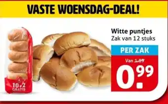 Geniet van onze heerlijke witte puntjes met onze speciale VASTE WOENSDAG-DEAL! Koop een zak van 10 witte puntjes en ontvang er 2 GRATIS bij. Dat zijn maar liefst 12 stuks voor de prijs van 10! Perfect voor een lekker ontbijt of lunch. De witte puntjes zijn luchtig, vers en overheerlijk. Nu tijdelijk verkrijgbaar voor slechts 1.89 per zak. Profiteer snel van deze geweldige aanbieding en haal jouw zak met 12 witte puntjes vandaag nog in huis. Deze deal is alleen geldig op woensdag, dus zorg ervoor dat je er op tijd bij bent. Mis het niet en geniet van de smaak van onze ambachtelijk gebakken witte puntjes!