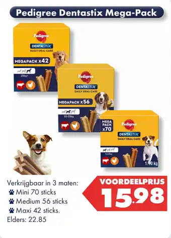 De Pedigree Dentastix Mega Pack is momenteel met korting verkrijgbaar bij Huisdier Voordeelshop. Hier vind je alle details over prijs, geldigheidsduur en actievoorwaarden. Vergeet niet om ook andere aanbiedingen en deals voor Pedigree Dentastix Mega Pack te bekijken zodat je zeker weet dat je de beste prijs betaalt. De kortingsactie loopt van 21-04-2026 tot 03-05-2026. Is de actie inmiddels verlopen? Geen zorgen, vergelijk dan soortgelijke aanbiedingen of volg de productcategorie voor toekomstige prijsverlagingen. Zo koop je altijd met voordeel.Veelgestelde vragen over Pedigree Dentastix Mega Pack