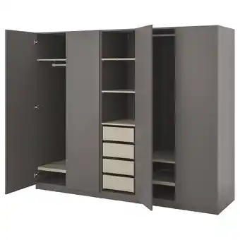 Een grijze pax-kledingkast met open deuren, die verstelbare planken en lades onthullen aanbieding bij IKEA