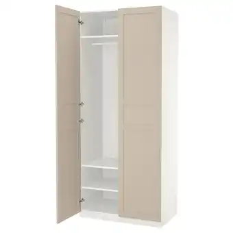Actuele Een open beige en witte pax kledingkast met één deur, planken en een ophangstang aanbieding bij IKEA van 12-02 t/m 2-03.