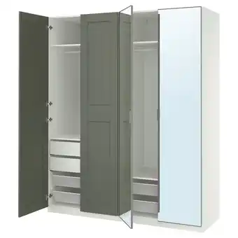 Actuele Een open ikea pax kledingkast met groene deuren, wit interieur en mesh manden aanbieding bij IKEA van 12-02 t/m 2-03.