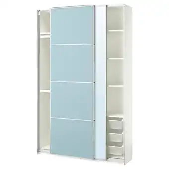 Actuele Een open, witte ikea pax kledingkast met lichtblauwe panelen en planken aanbieding bij IKEA van 12-02 t/m 2-03.