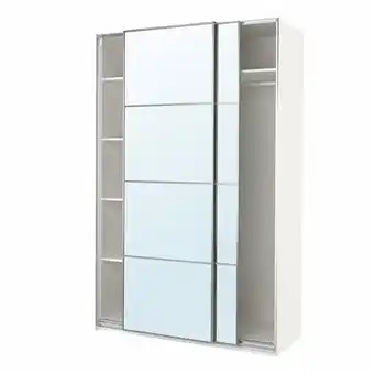 Een witte ikea pax kledingkast met gespiegelde schuifdeuren en interne planken aanbieding bij IKEA