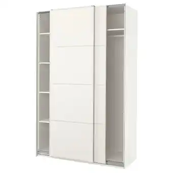 Een witte ikea pax kledingkast met schuifdeuren en planken aanbieding bij IKEA