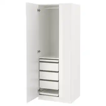 Een witte ikea pax kledingkast met spiegeldeuren, schuiflades en planken binnenin aanbieding bij IKEA