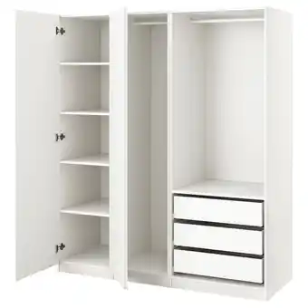 Een witte ikea pax kledingkast set met open deuren die planken en lades onthullen aanbieding bij IKEA