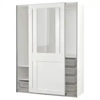 Een witte pax kledingkast met glazen schuifdeuren, met een strak en modern design aanbieding bij IKEA