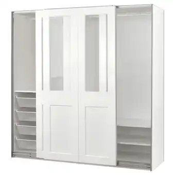 Actuele Een witte pax kledingkast met glazen schuifdeuren, voorzien van planken en opbergvakken aanbieding bij IKEA van 12-02 t/m 2-03.