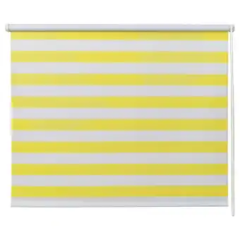 Actuele Geel/wit gestreept fridans rolgordijn, gemaakt van gerecycled polyester, horizontale strepen aanbieding bij IKEA van 9-04 t/m 27-04.
