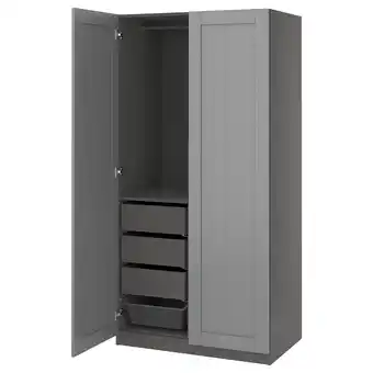 Grijze kledingkast met open deur, drie lades, metalen gaas bodem. Modern, strak design, grijze kleur aanbieding bij IKEA
