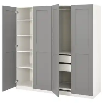 Actuele Grijze pax-kledingkast, open deuren met planken en lades, modern design aanbieding bij IKEA van 12-02 t/m 2-03.