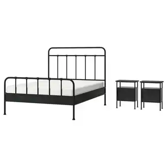Modern zwart metalen bed met gebogen lijnen en twee bijpassende nachtkastjes aanbieding en online acties bij IKEA