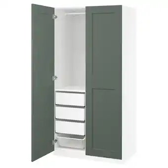 Moderne pax kledingkast met groene deuren, wit interieur, planken en lades aanbieding bij IKEA