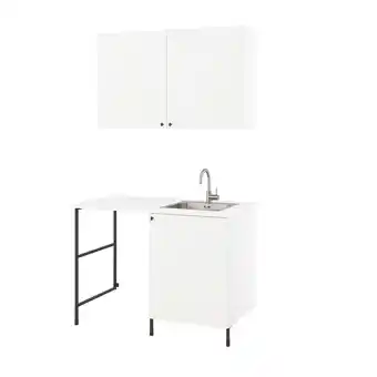 Nu in de aanbieding bij IKEA: Moderne witte enhet wasunit met spoelbak, opbergruimte en zwarte metalen accenten✅ Actie geldig van 18-12 t/m 12-01.