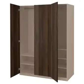 Actuele Pax kledingkast, beige, houtafwerking, 3-delig, open deuren, planken, ophangrail aanbieding bij IKEA van 12-02 t/m 2-03.