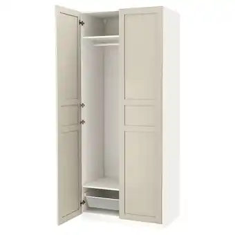 Actuele Witte pax kledingkast met beige deuren, verstelbare planken en zachtsluitende scharnieren aanbieding bij IKEA van 12-02 t/m 2-03.