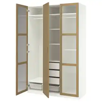 Koop Witte pax kledingkast met eikenhouten bekleding, glazen deuren open, met planken en lades komende week met korting